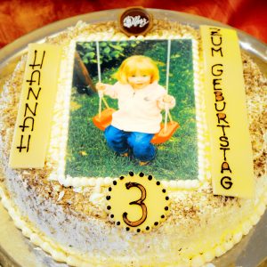 Beliebt sind Fototorten, bei denen ein Foto oder Zeichnung mit Lebensmittelfarbe auf Fondantpapier gedruckt wird. Senden Sie uns dazu einfach Ihr Wunschmotiv per E-Mail.