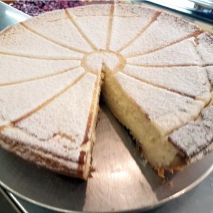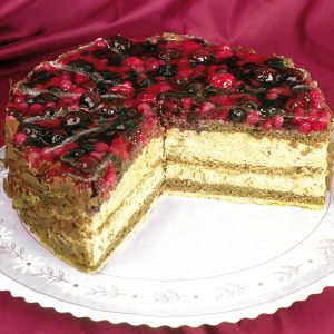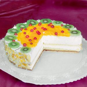 Stachelbeer mit Baiser, Stachelbeer mit Makronengitter, Johannisbeer mit Baiser, Himbeertorte, Obstsalat-Torte, Erdbeertorte (saisonal) und Schmandtorte mit Mandarinen.